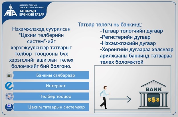 Хувь хүн, хуулийн этгээд татвараа төлөхдөө “Цахим төлбөрийн систем”-ээр дамжуулан бүртгэх, хяналт тавих боломжтой болжээ.