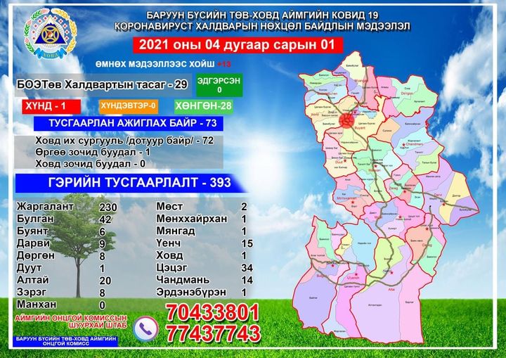 Ховд аймгийн хэмжээнд Ковид-19-ийн халдварын батлагдсан тохиолдлын тоо 29 болжээ. Эдгээр иргэнийг Бүсийн оношилгоо эмчилгээний төвд хэвтүүлэн эмчилж байгаа бөгөөд нэг хүний биеийн байдал хүнд байгаа гэлээ. Өнөөдрийн байдлаар нийт 73 иргэн тусгаарлан ажиглах байранд, 393 иргэн гэрийн тусгаарлалтад байна. Аймгийн Онцгой комисс, Шуурхай штаб, мэргэжлийн бусад байгууллагууд чиг үүргийнхээ дагуу ажилласаар байна.