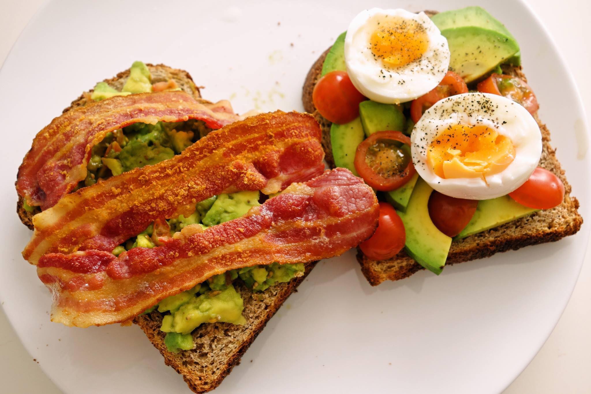 4. Бяцалсан авокадогоо жижиглэн хэрчсэн улаан лоольтойгоо хольж, давс перцээр амтлаад, хоёр дахь талхан дээрээ түрхэж, беконоо дээрээс нь тавина.