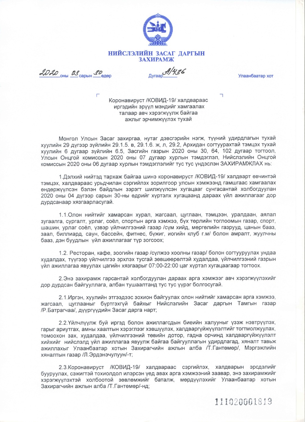Дэлхий нийтэд тархаад буй коронавирусийн халдвараас урьдчилан сэргийлэх арга хэмжээнүүдийг чангатгах Улсын онцгой комиссын шийдвэрийн дагуу “Иргэдийн эрүүл мэндийг хамгаалах талаар авч хэрэгжүүлж байгаа ажлыг эрчимжүүлэх тухай” нийслэлийн Засаг даргын А/223 дугаар захирамж болон “12 хүртэлх насны хүүхэдтэй эхчүүдийн ажлын цагийг хорогдуулах тухай” А/268 тоот захирамжийн үйлчлэх хугацааг ирэх дөрөвдүгээр сарын 30-ны өдрийг хүртэл сунгаж байгаатай холбогдуулан Нийслэлийн Засаг даргын “Коронавируст /КОВИД -19/ халдвараас иргэдийн эрүүл мэндийг хамгаалах талаар авч хэрэгжүүлж байгаа ажлыг эрчимжүүлэх тухай” А/436 тоот захирамж гарлаа.