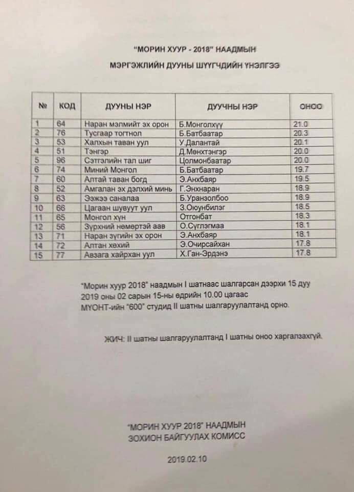 Жил бүр уламжлал болон зохион байгууллагддаг оны шилдэг дуу шалгаруулах "Морин хуур" наадмын эхний шатны шалгаруулалт өндөрлөлөө. 32 дахь удаагийн наадамд 100 гаруй дуу өрсөлдсөнөөс нэгдүгээр шатанд 15 бүтээлийг сонгож дараагийн шатанд өрсөлдөхөөр болсон байна. Үүнд "Наран мэлмийт эх орон", "Миний монгол", "Тэнгэр" зэрэг бүтээл багтсан байна. Харин өнгөрсөн оны шилдэг дууг ирэх сарын 2-нд …