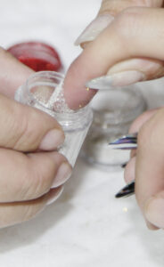 Хумсандаа суурь /Base/ тавьсны дараа бүрэн хатахаас нь өмнө жижиг ширхэгтэй саатай савандаа хумсаа бүрэн дүрнэ. Наалдсан сааг хурууны өндгөөр хүчтэй биш жигд дарж, илж өгснөөр таны хумсны гадарга дээр гялалзсан металл гадаргуу үүснэ. Гадаргууг бэхжүүлэгч /top/-ээр будаж өгснөөр будаг таны хумсан дээр 2-3 хоног тогтох болно.